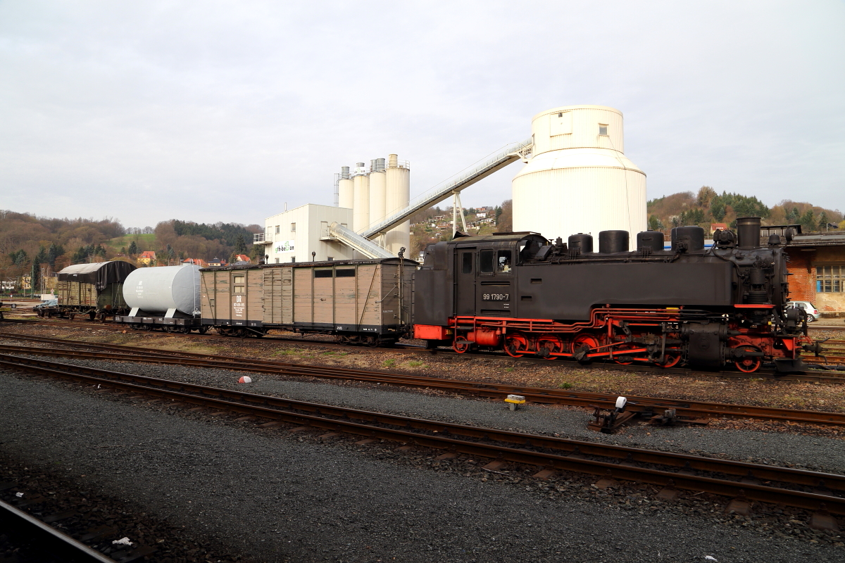 Dampflok 99 1790 (sächsische VII K) zusammen mit einer kleinen Güterwagengarnitur, kalt abgestellt im Bahnhof Freital-Hainsberg. (Aufnahme vom 04.04.2016)