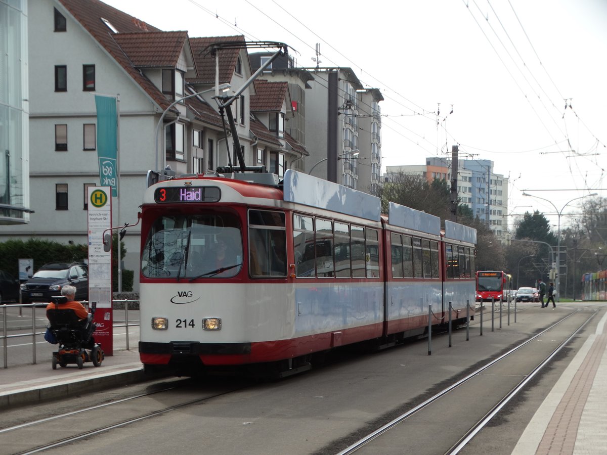 Freiburger VAG Düwag GT8K Wagen 214 am 24.03.17 in Neubaugebiet von einen Gehweg aus fotografiert