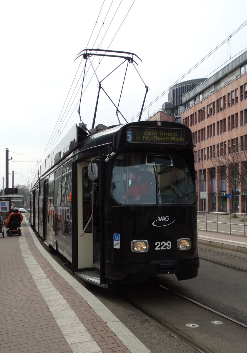 Freiburger VAG Düwag GT8N Wagen 229 am 24.03.17 in Neubaugebiet von einen Gehweg aus fotografiert