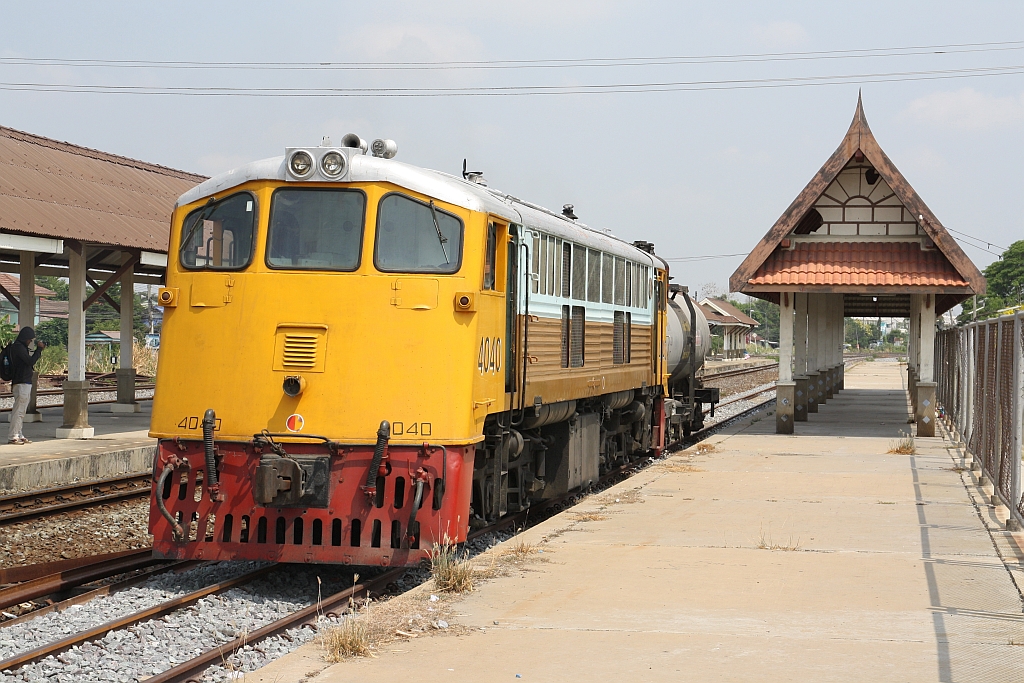 GEK 4040 (Co'Co', de, General Electric, Bj.1963, Fab.Nr. 34889) umfährt am 26.März 2017 im Bf. Ayutthaya den zum Brandschutz für den Dampfsonderzug 901/902 eingesetzten บ.ท.ค.126021 (บ.ท.ค. =B.O.T./Bogie Oil Tank Wagon).