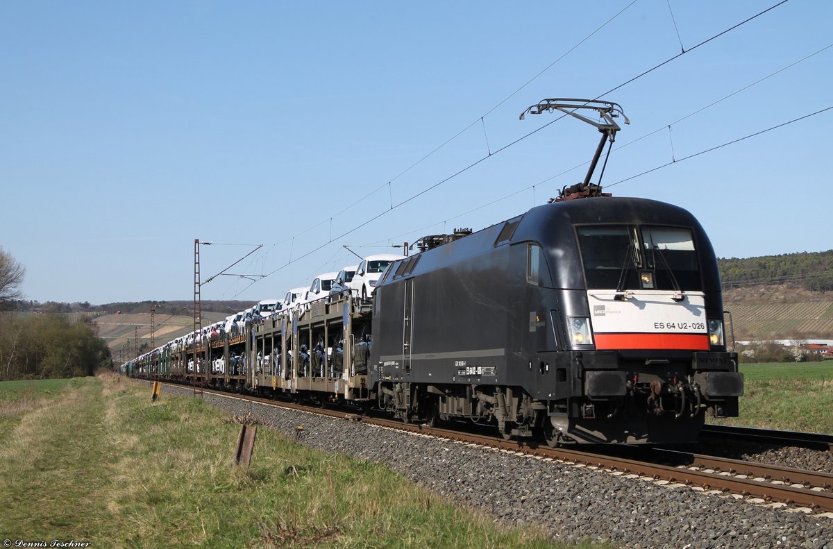182 526 MRCE mit einem Autologistiker bei Retzbach-Zellingen am 28.03.2017 südwärts in Richtung Würzburg