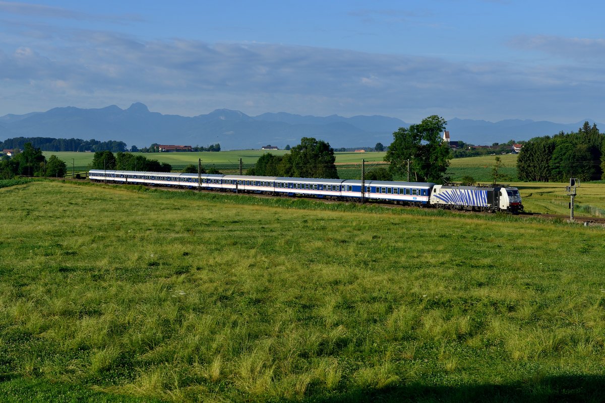 Am 08. Juli 2016 stand ich erneut früh auf, um noch eine Motiv-Variation des zwischen Salzburg und München vereinigt verkehrenden EN 462 / EN 498 bei Haus aufzunehmen. Diesmal wurde mehr Brennweite verwendet. An diesem Tag beförderte 1116.113 den aus Wagen dreier Bahnverwaltungen gebildeten Zug, der gerade von den ersten Sonnenstrahlen ausgeleuchtet wird.