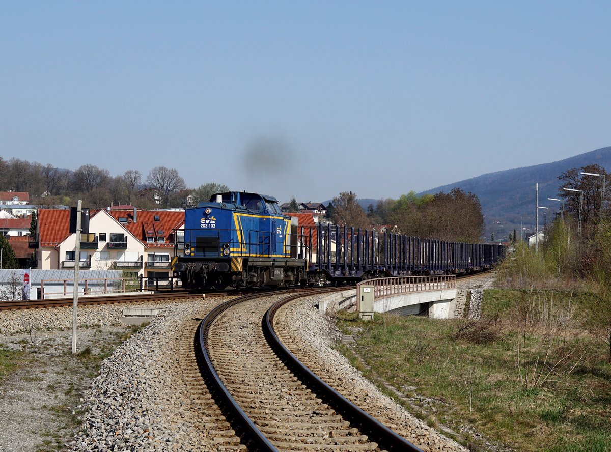Die 203 102 mit einem Güterzug am 01.04.2017 bei der Ausfahrt aus dem Deggendorfer Hbf.