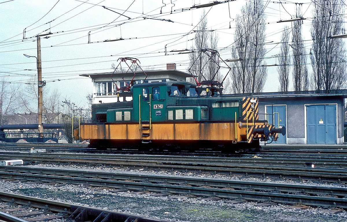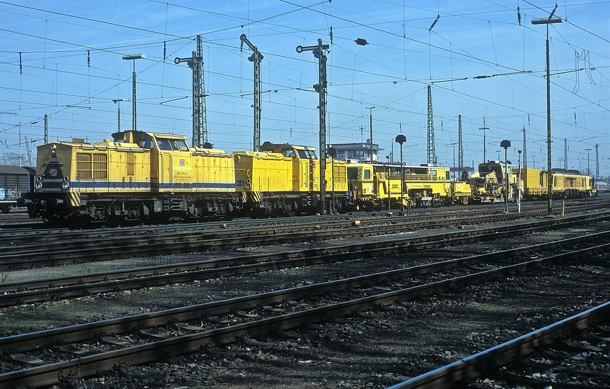 Arbeitswagen und Düwag Tram 222 am 24.5.1990 im Betriebshof der Stadt Heidelberg.