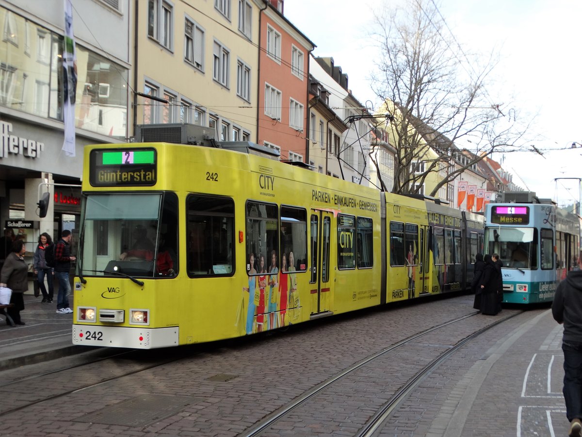 Freiburger VAG Düwag GT8Z 242 am 20.03.17 in der Innenstadt