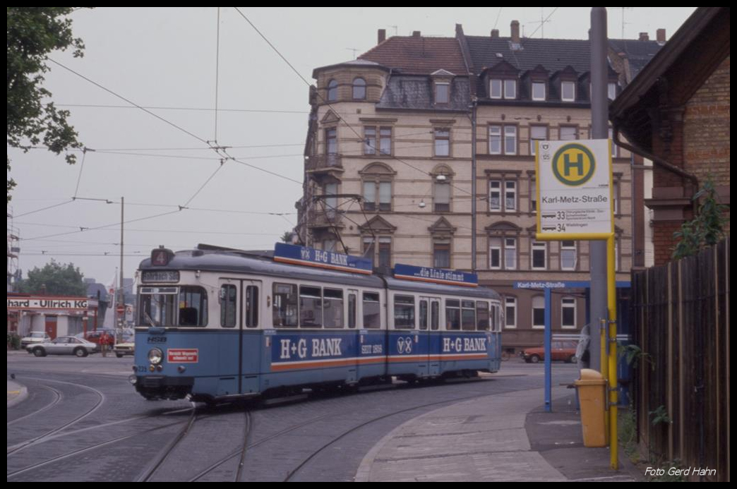 Tram 235 der Linie 4 erreicht hier am 24.05.1990 den Haltepunkt Karl Metz Straße in Heidelberg.