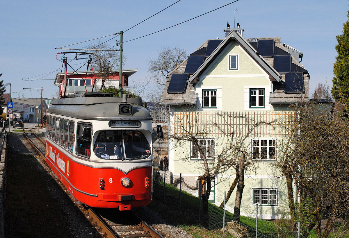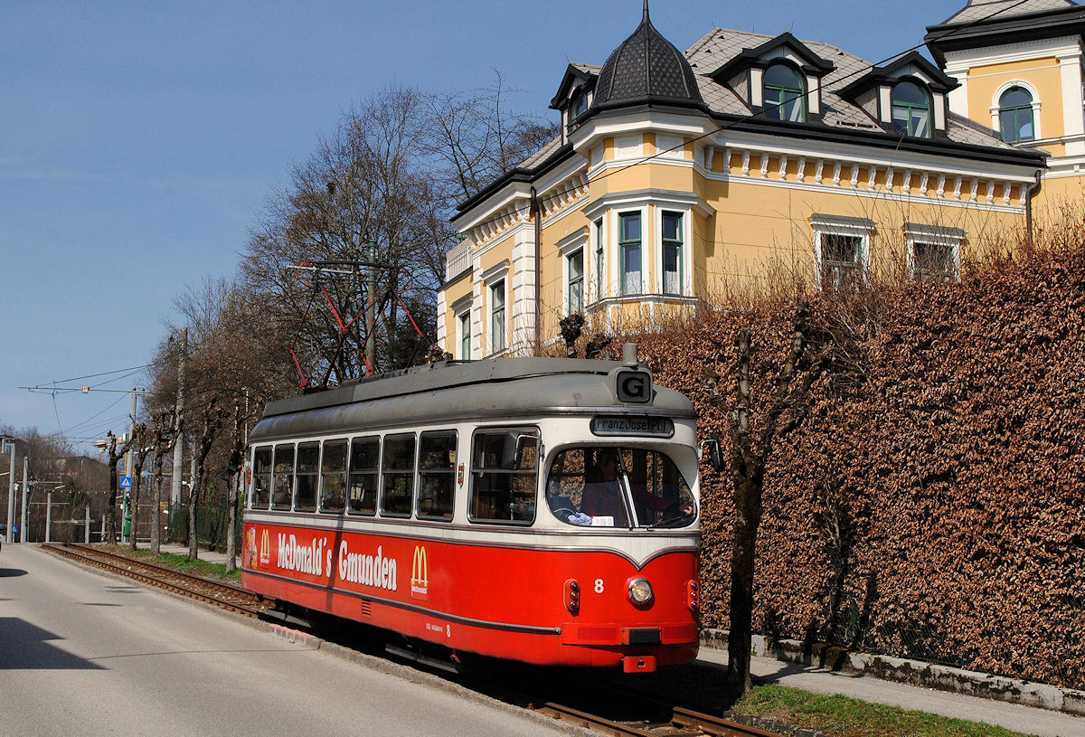 Tw.8 in der Kaltenbrunnerstraße, die in diesem Bereich mit einer Steigung von 96 Promille zum steilsten Abschnitt der Gmundner Straßenbahn zählt. (25.03.2017)