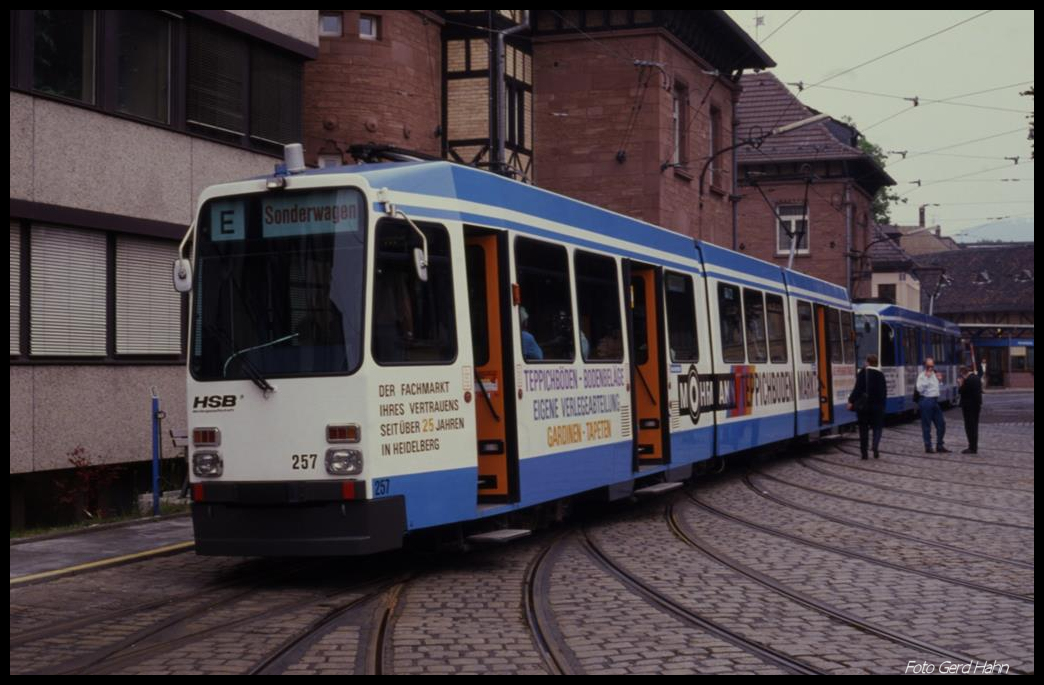 Wagen 257 der Heidelberger Straßenbahn wird hier am 24.5.1990 für eine Sonderfahrt des BDEF im Betriebshof bereit gestellt.
