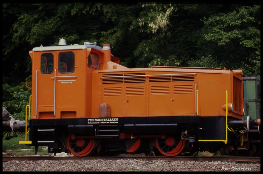 Am 24.05.1990 war dies äußerlich top aufgearbeitete und offensichtlich auch fahrbereite Jung Diesellok noch auf den Gleisen der Steinachtalbahn im ehemaligen Bahnhof Schönau zu sehen.