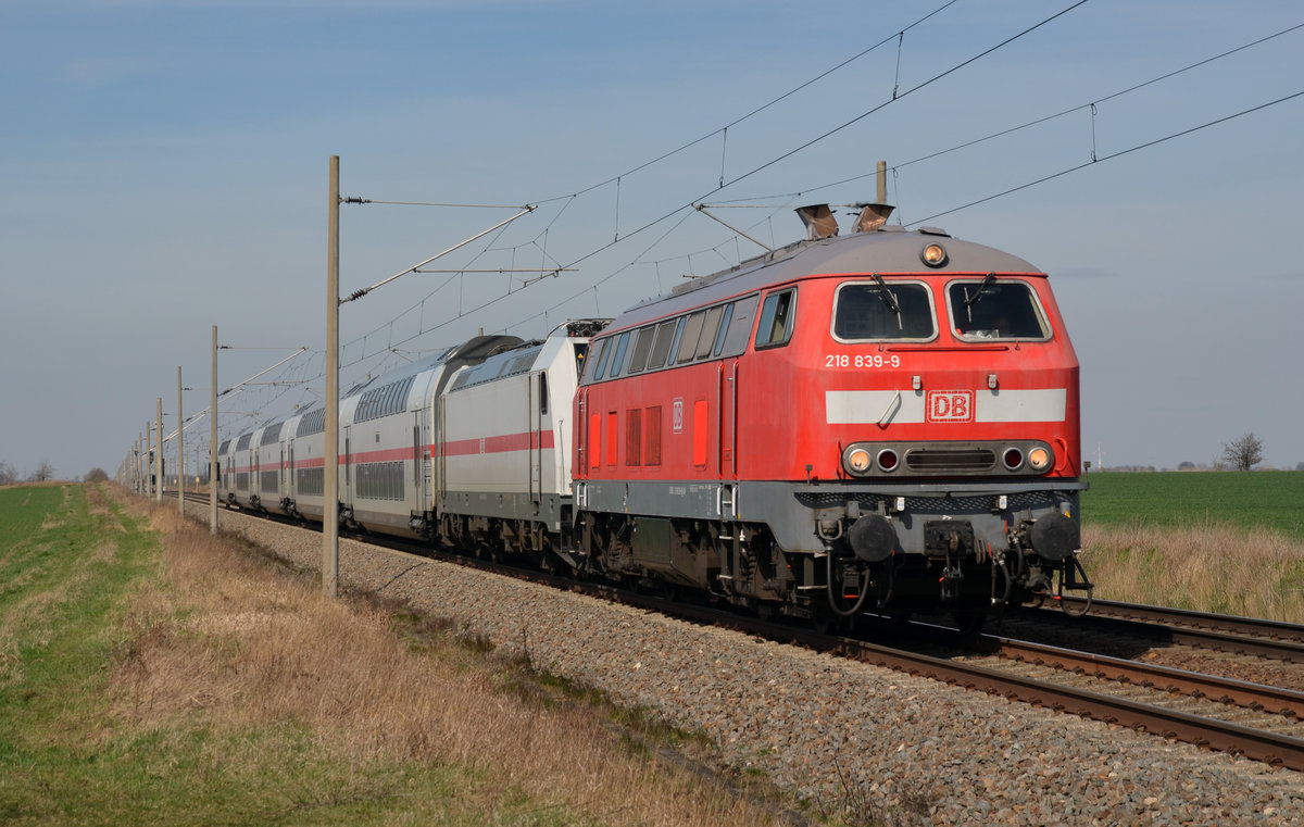 218 839 schleppte am 25.03.17 einen Dosto-IC durch Eismannsdorf Richtung Halle(S).