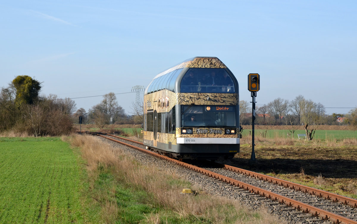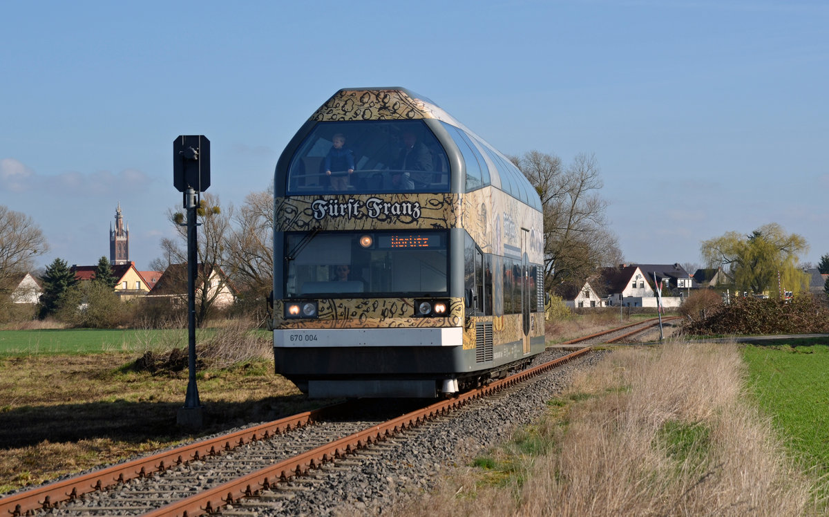 670 004 alais Fürst Franz hat am 26.03.17 Wörlitz verlassen und passiert nun die Ortschaft Griesen. In Oranienbaum wurde die Linie gebrochen. Fürst Franz pendelte den ganzen Tag zwischen Oranienbaum und Wörlitz hin und her.