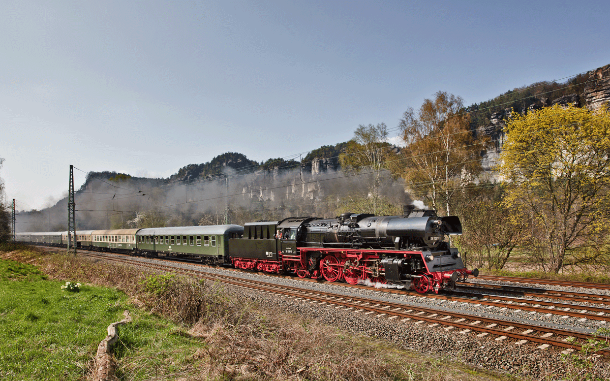 Die Dampflokomotive 35 1097-1 fährt mit einem Sonderzug vom Dresdner Dampfloktreffen nach Decin CZ im Kurort Rathen vorüber.Bild vom 9.4.2017