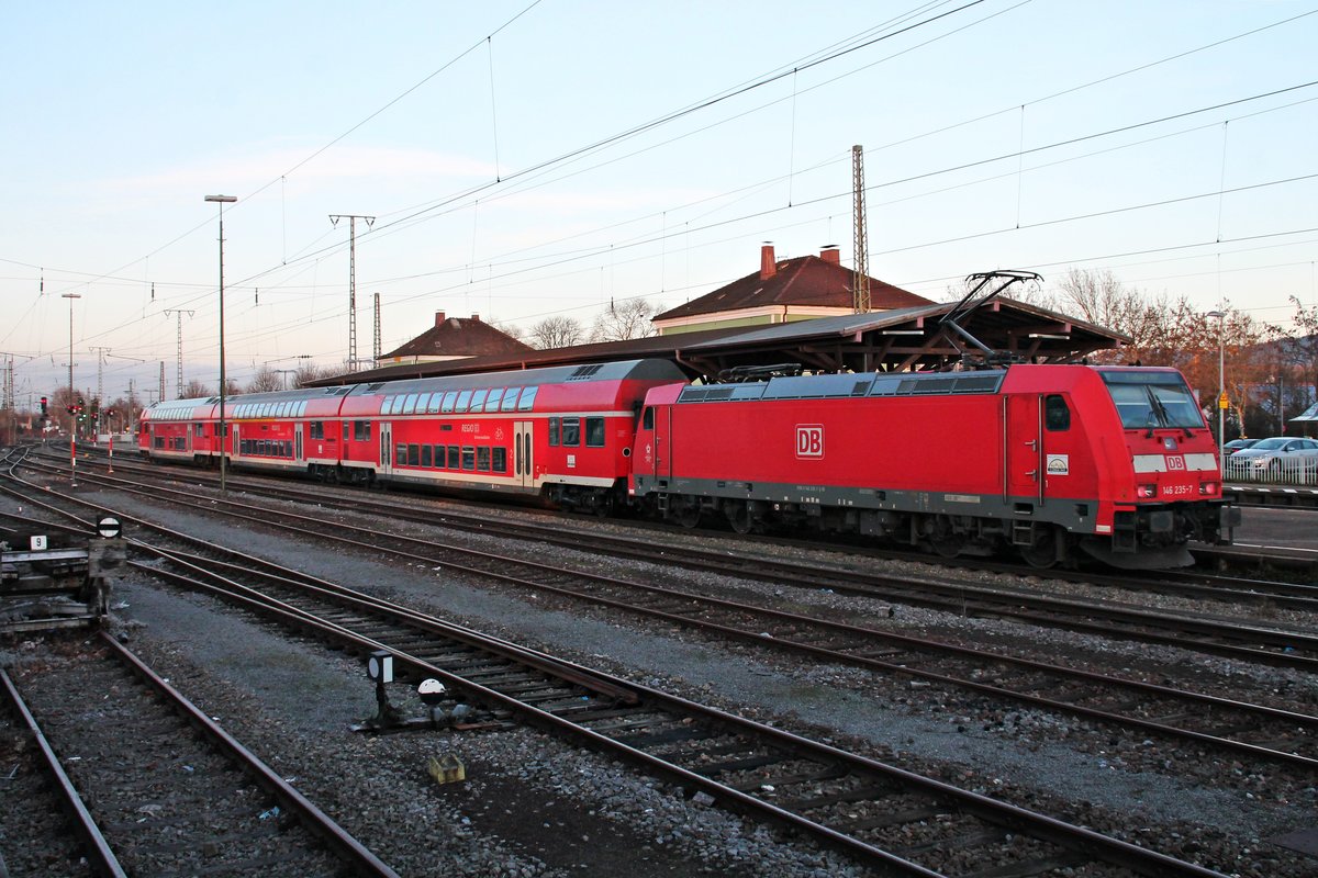 Nachschuss auf 146 235-7 "Konstanz", als sie mit einer RB (Neuenburg (Baden) - Freiburg (Brsg) Hbf) auf Gleis 5 in Müllheim (baden) stand und auf die Abfahrt wartete.