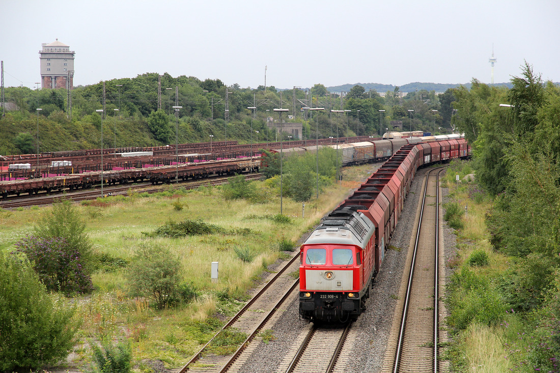 Auf dem Weg zum Hüttenwerk Krupp Mannesmann (HKM) durchfährt 232 908 mit ihrem beeindruckenden Ganzzug auch den Güterbahnhof Duisburg-Hochfeld Süd. Das Foto entstand am 8. August 2017.