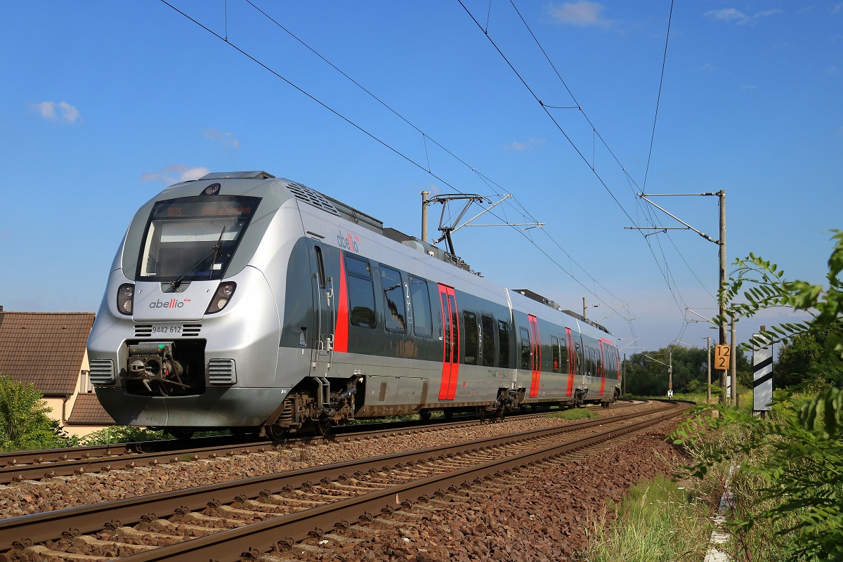 9442 612 (Bombardier Talent 2) von Abellio Rail Mitteldeutschland als verspätete RB 74778 (RB75) von Eilenburg nach Röblingen am See in Zscherben, Angersdorfer Straße, auf der Bahnstrecke Halle–Hann. Münden (KBS 590). [3.8.2017 - 16:51 Uhr]