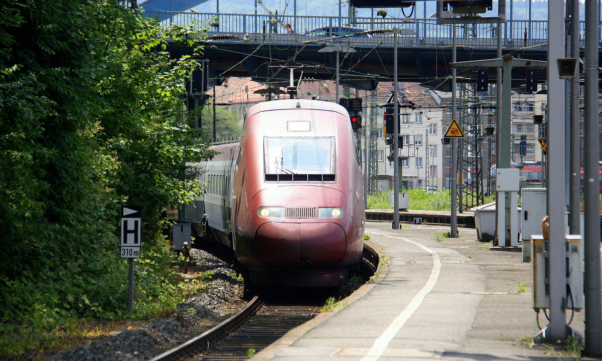 Der Thalys aus Paris(F) nach Essen-Hbf und kommt aus Richtung Belgien,Aachen-Süd(D) und fährt gleich in den Aachener-Hbf ein.