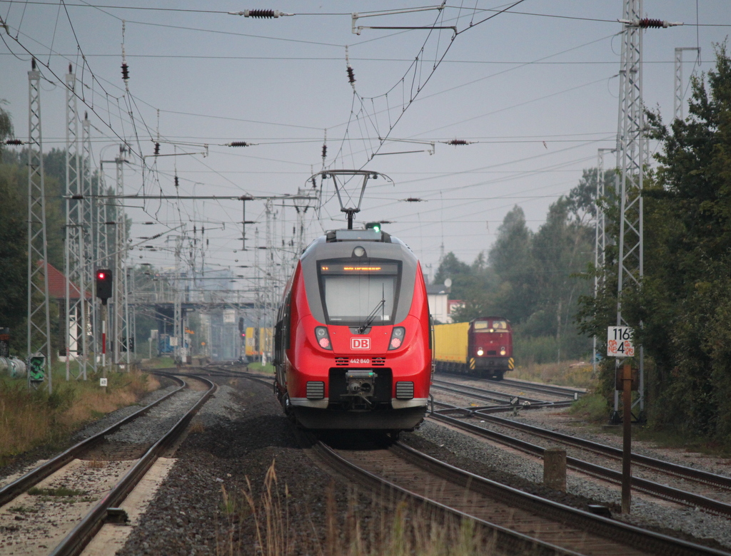 442 840 als S1(Rostock-Warnemünde)bei der Ausfahrt im Haltepunkt Rostock-Holbeinplatz.25.08.2017