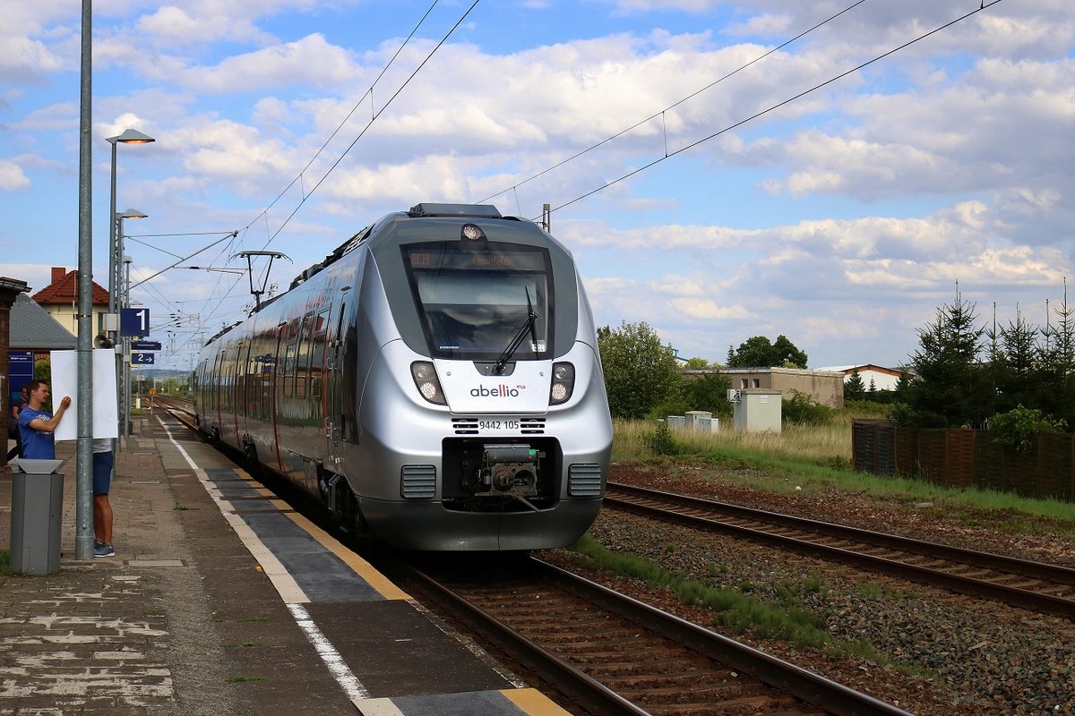 9442 105 (Bombardier Talent 2) von Abellio Rail Mitteldeutschland als RE 74730 (RE19) von Bitterfeld nach Leinefelde erreicht den Bahnhof Berga-Kelbra auf der Bahnstrecke Halle–Hann. Münden (KBS 590). [4.8.2017 - 17:21 Uhr]