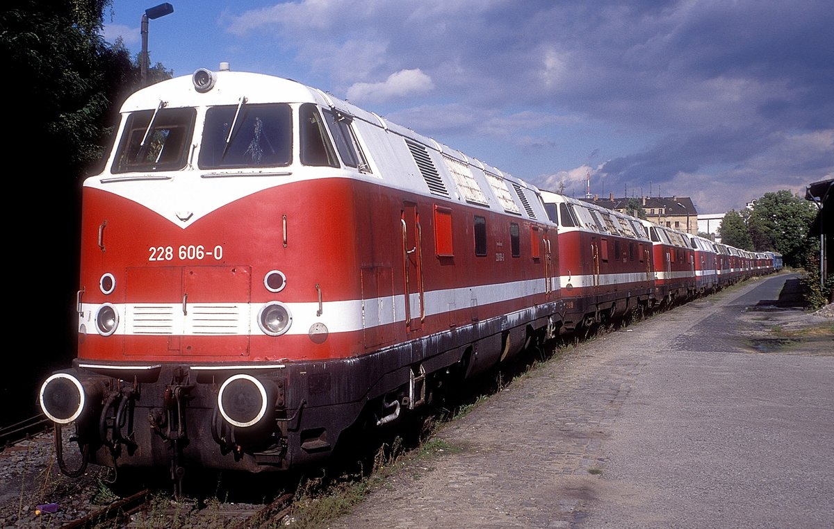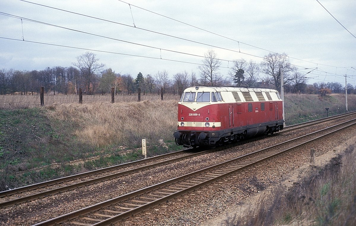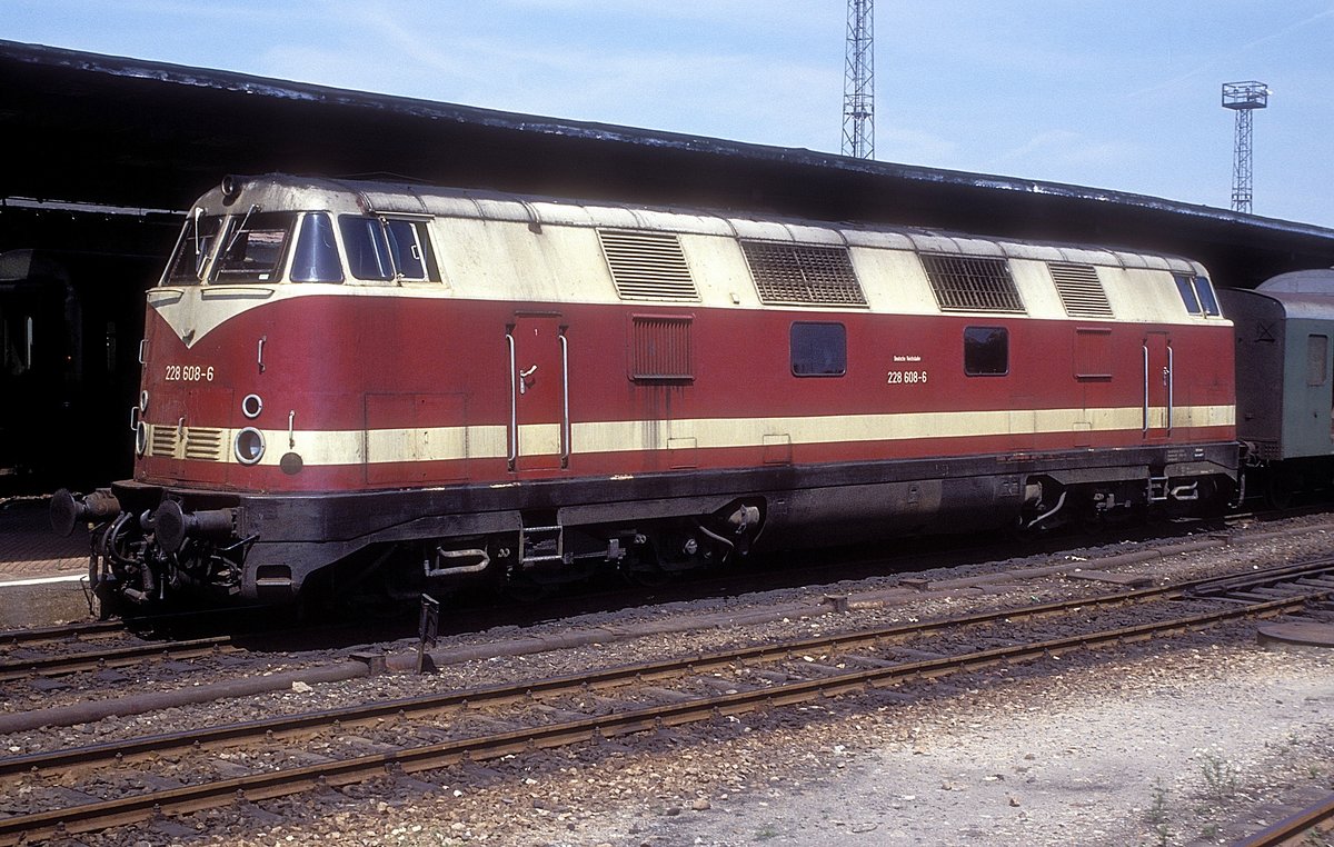 Schwere Diesellok DR 120366 am 19.5.1991 im BW Staßfurt.