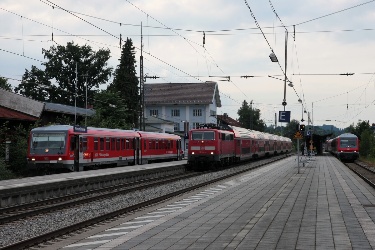 Am 27.06.2013 wurden in Prien am Chiemsee noch alle normalspurigen Leistungen durch die DB erbracht. Von links nach rechts zu sehen: 628/928 565 als RB27663, 111 204+RE79035 und RE69615 (+111 019).