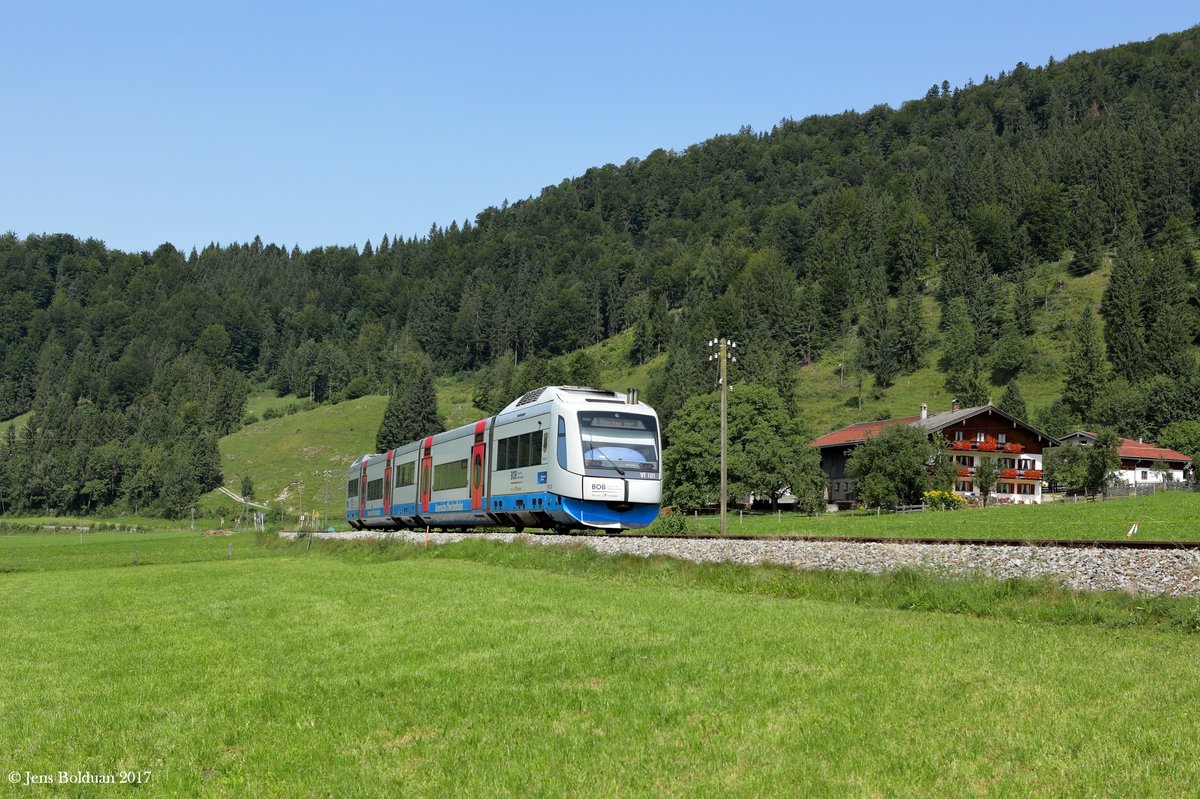 Oberbayerische Landidylle: ein Zug der BOB auf dem Weg von Bayrischzell in die Landeshauptstadt
