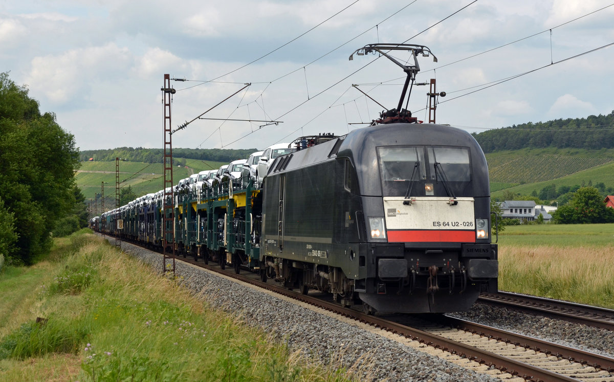 182 526 schleppte am 16.06.17 einen Autozug durch Retzbach-Zellingen Richtung Würzburg.