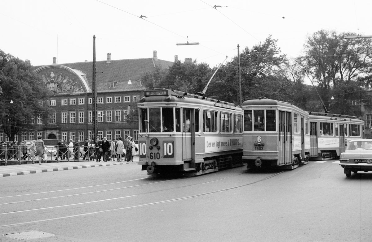 København / Kopenhagen Københavns Sporveje SL 10 (Tw 610 + Bw 15xx) / SL 6 (Bw 1503 + Tw der Serie 501 - 618) København K (Stadtmitte), Holmens Bro im September 1968. - Scan von einem S/W-Negativ. Film: Ilford FP3.