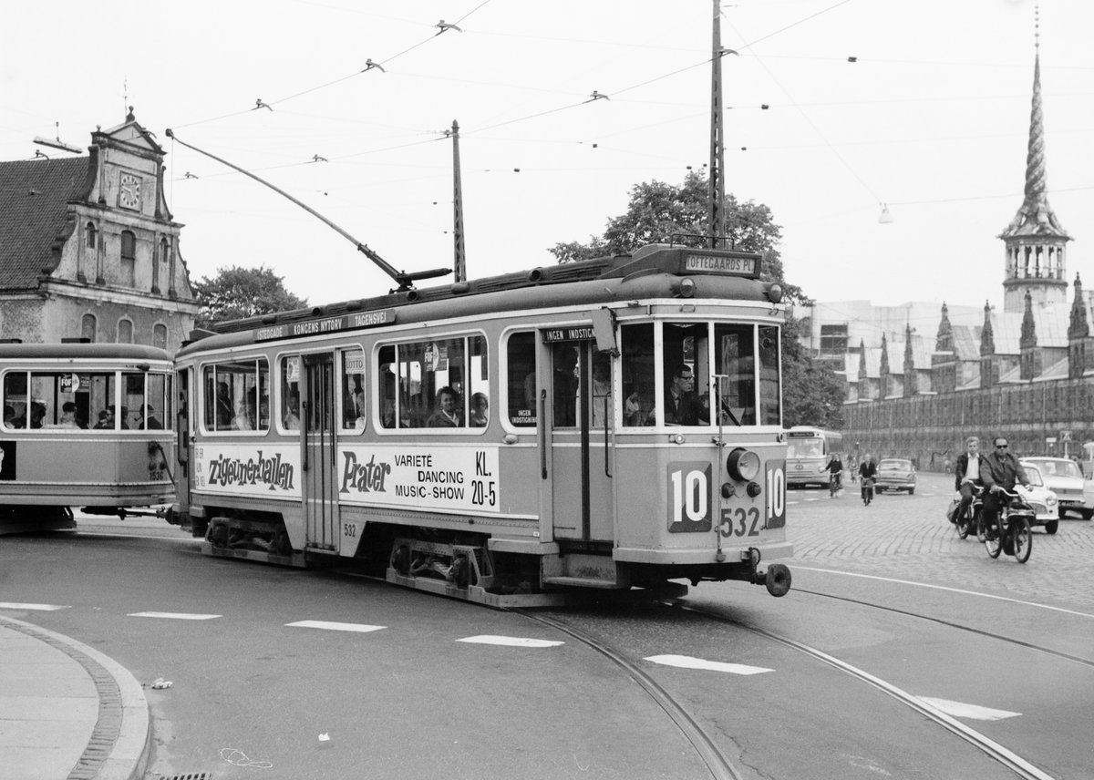 København / Kopenhagen Københavns Sporveje SL 10 (Tw 532 + Bw 1536) København K (Stadtmitte), Holmens Bro / Christiansborg Slotsplads im September 1968. - Links (hinter dem Bw) sieht man einen kleinen Teil der Holmens Kirke; im Hintergrund rechts lässt sich ein Teil der Kopenhagener Börse sehen. - Scan von einem S/W-Negativ. Film: Ilford FP3.