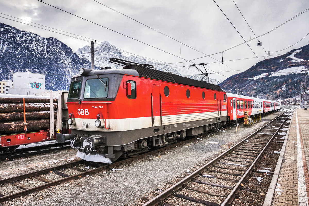1144 281-3 steht am 30.11.2017 mit einer 3-teiligen CS-Garnitur im Bahnhof Lienz.