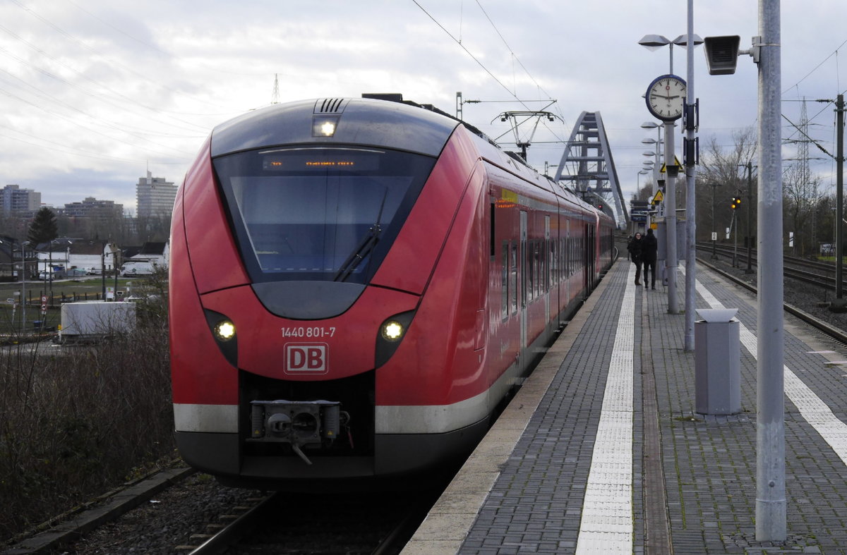 1440 301 und 326 als S8 nach Hagen in Düsseldorf-Hamm. Im Hintergrund der Bogen der Hammer Rhheinbrücke zwischen Neuss und Düsseldorf (14.12.17).