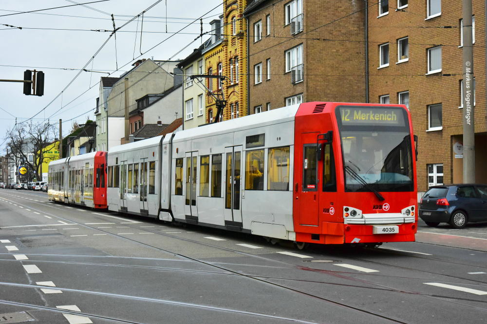 4035 wurde die Ganzreklame "111 Jahre Prinzengarde" entfernt. Hier zu sehen wieder im aktuellen KVB-Farbschema auf der Neusser Straße am 07.12.2017.