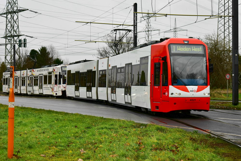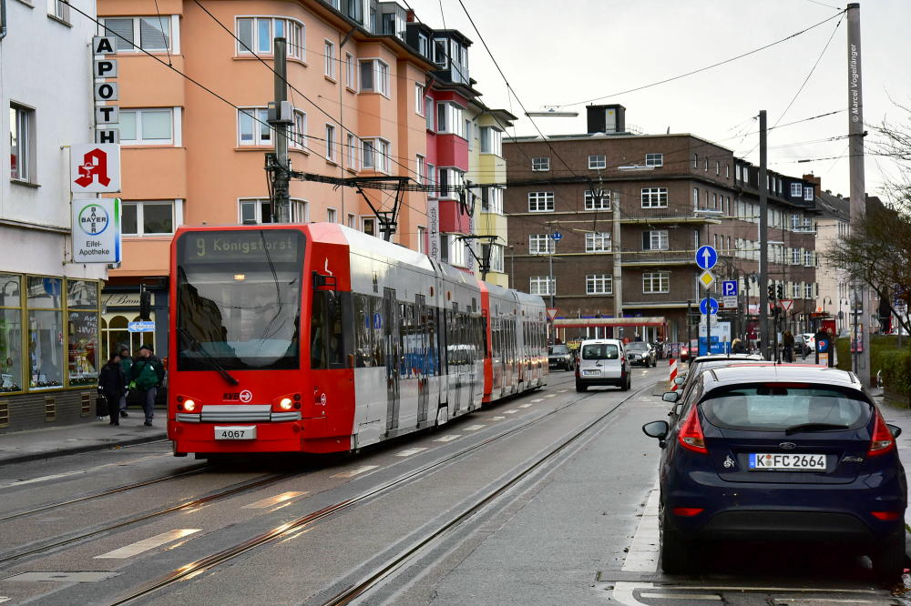 4067 wurde die Ganzreklame "Segmüller" entfernt. Hier zu sehen wieder im aktuellen KVB-Farbschema in Sülz am 14.12.2017.