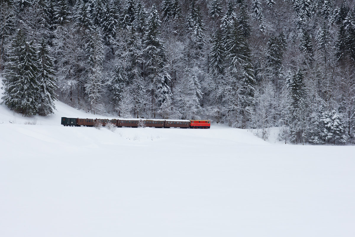 Die Nikolausfahrten der Bregenzerwälderbahn. Kurz vor dem Haltepunkt Reuthe, Fahrtrichtung Bezau. 10.12.2017