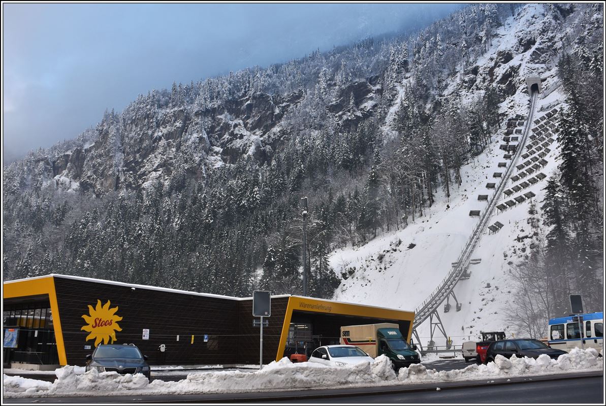 Neue Stoosbahn - steilste Standseilbahn der Welt mit 110%. Ankunft im autofreien Stoos auf 1313m ü/M. Zwischen 3 und 5 Minuten dauert die Überwindung der 743 Höhenmeter. (20.12.2017)