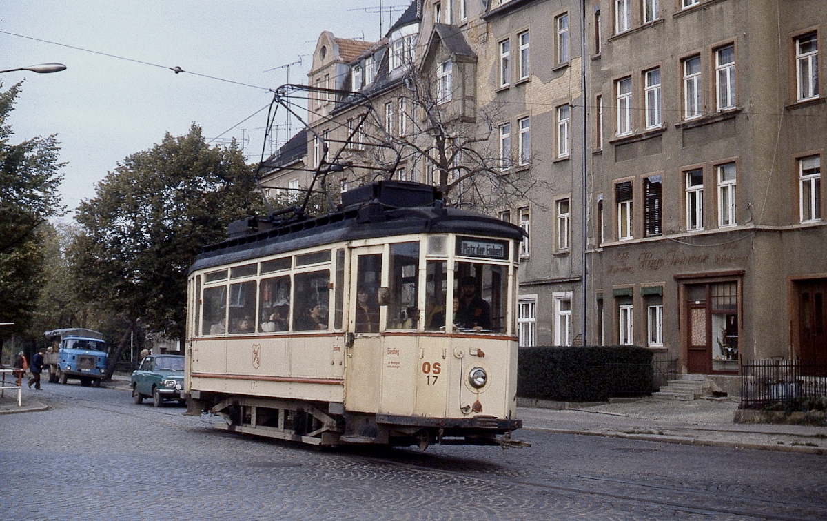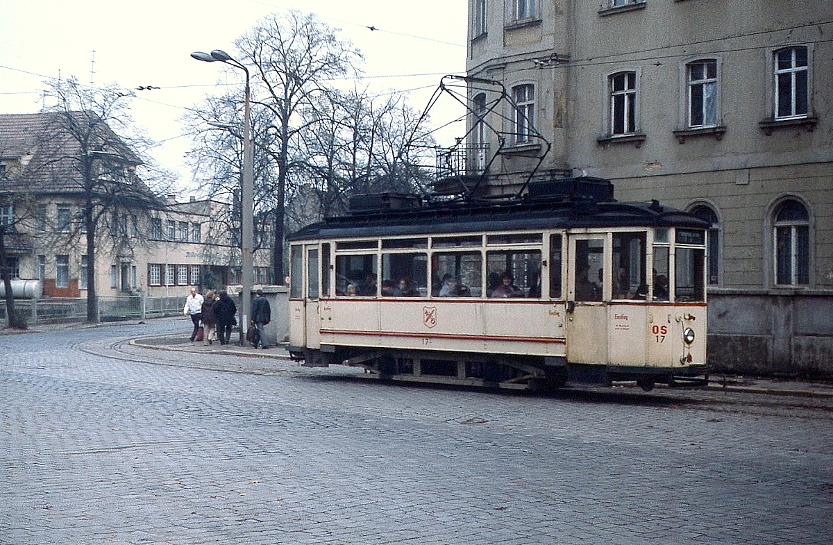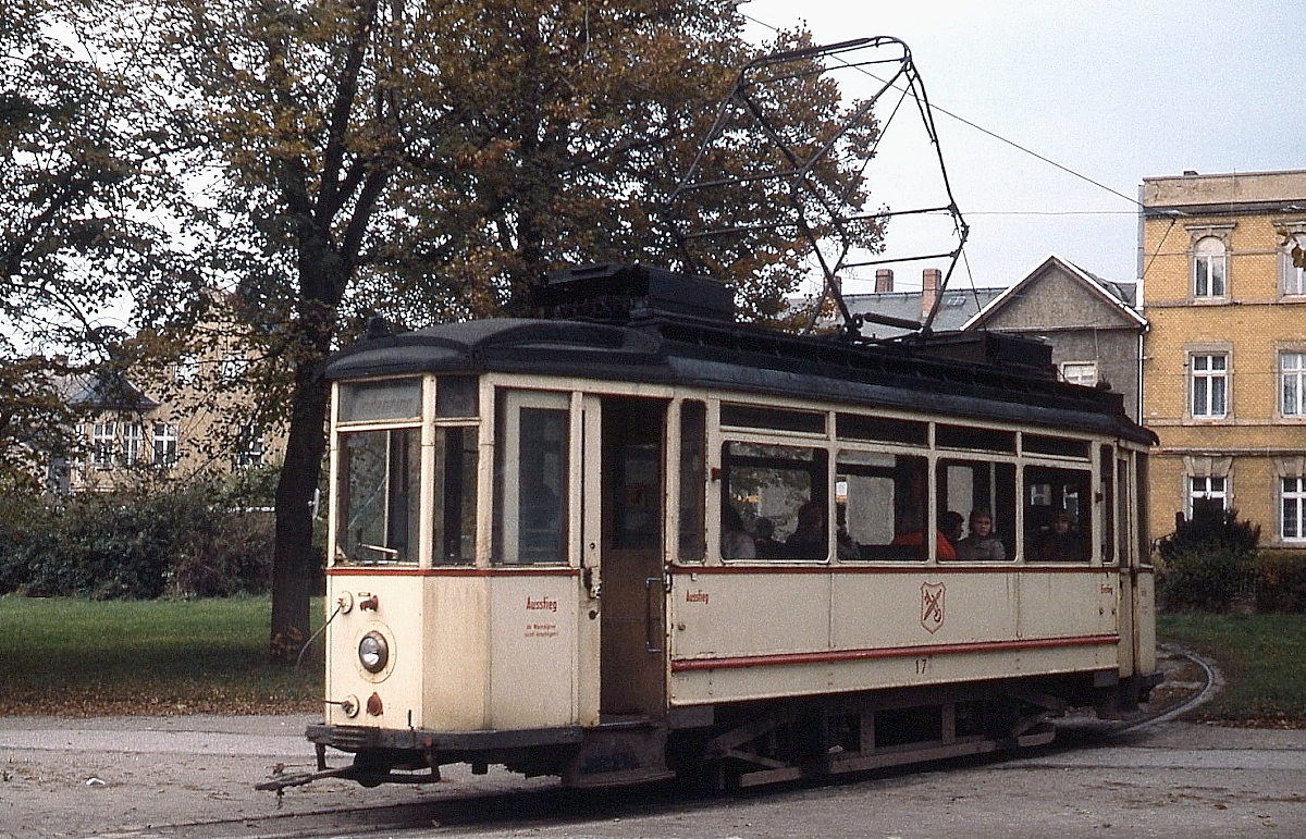 Straßenbahn Naumburg im Oktober 1980: Portrait des 1928 gebauten Tw 17. Zu diesem Zeitpunkt war der Ringverkehr unterbrochen, die Straßenbahn verkehrte lediglich zwischen Platz der Einheit (heute Theaterplatz) über den Hauptbahnhof zum Lindenring.