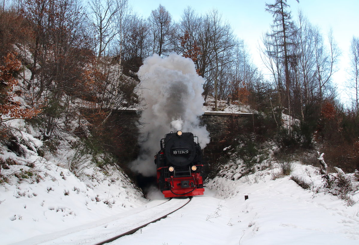 Winterdampf auf der Harzquerbahn. 99 7234 mit dem N8933 bei der Ausfahrt aus dem Thumkhulentunnel.