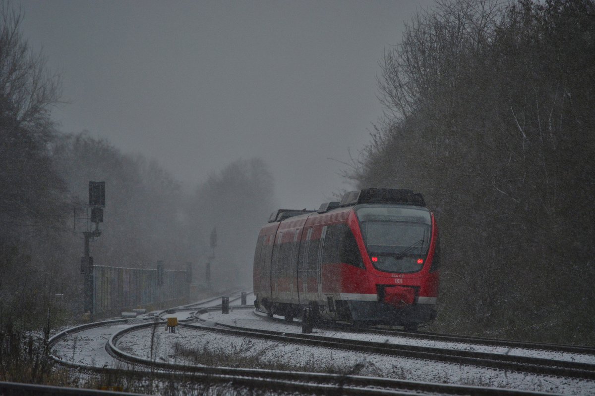 Der letzte Fahrtag des RB38 zwischen Bedburg und Düsseldorf. Den leichten Schneefall meistern die 644er nach vielen Jahren in der Eifel mühelos. Hier brummt 644 031 als RB11811 nach Köln Messe/Deutz pünktlich in Grevenbroich ein. Grevenbroich 09.12.2017
