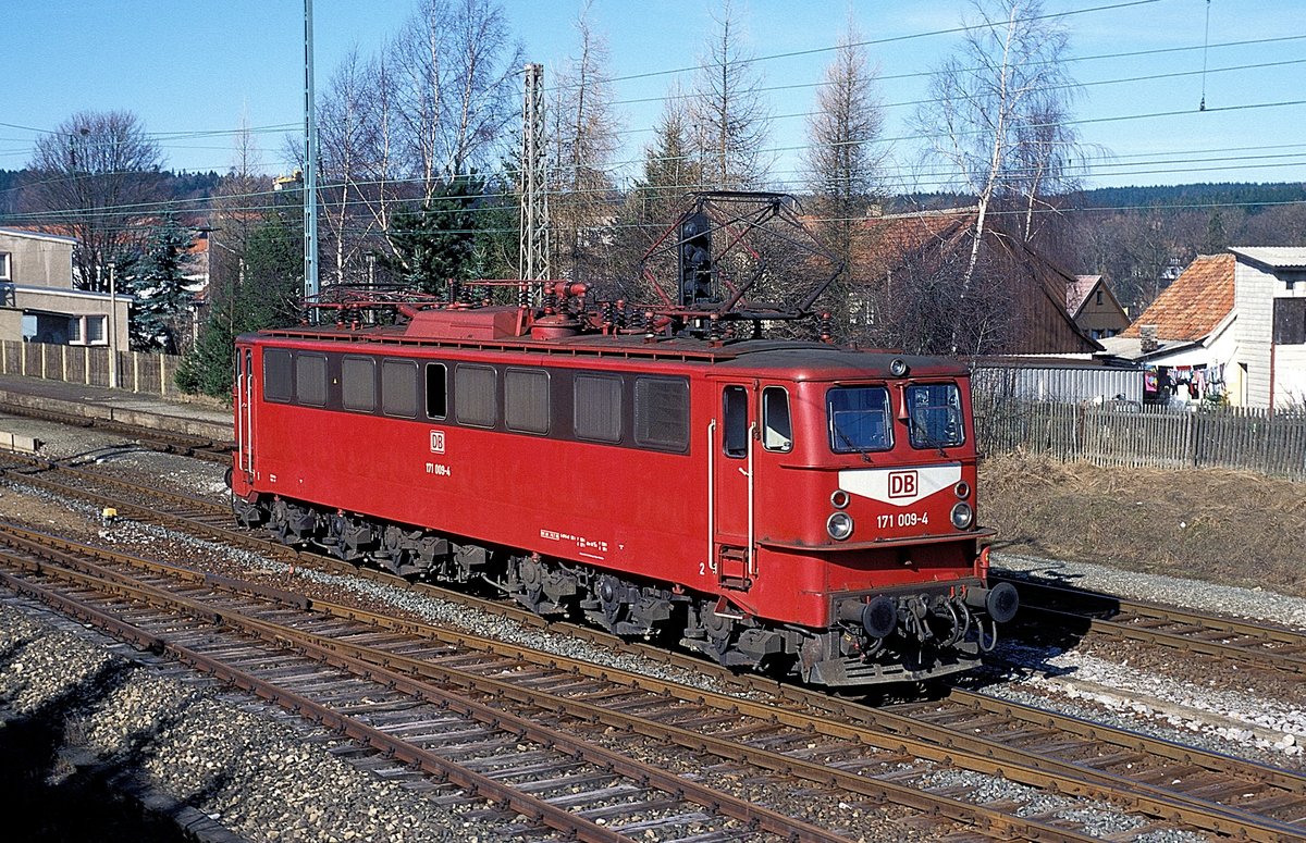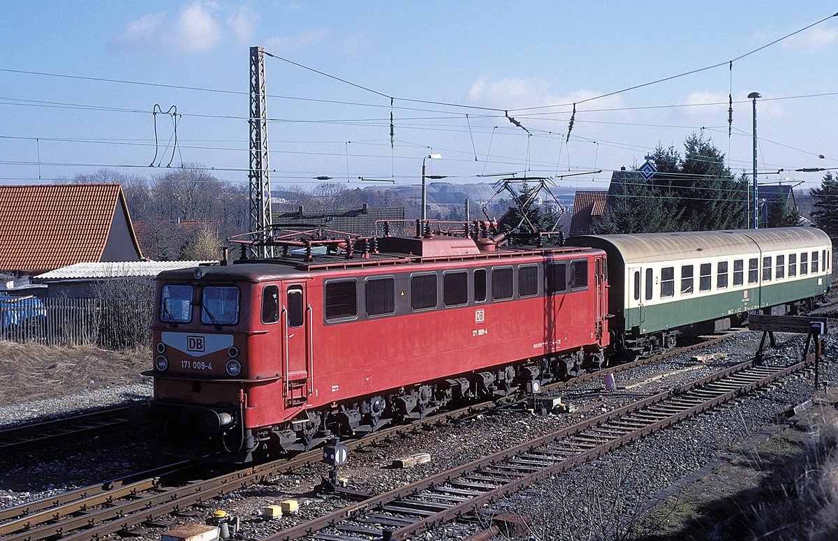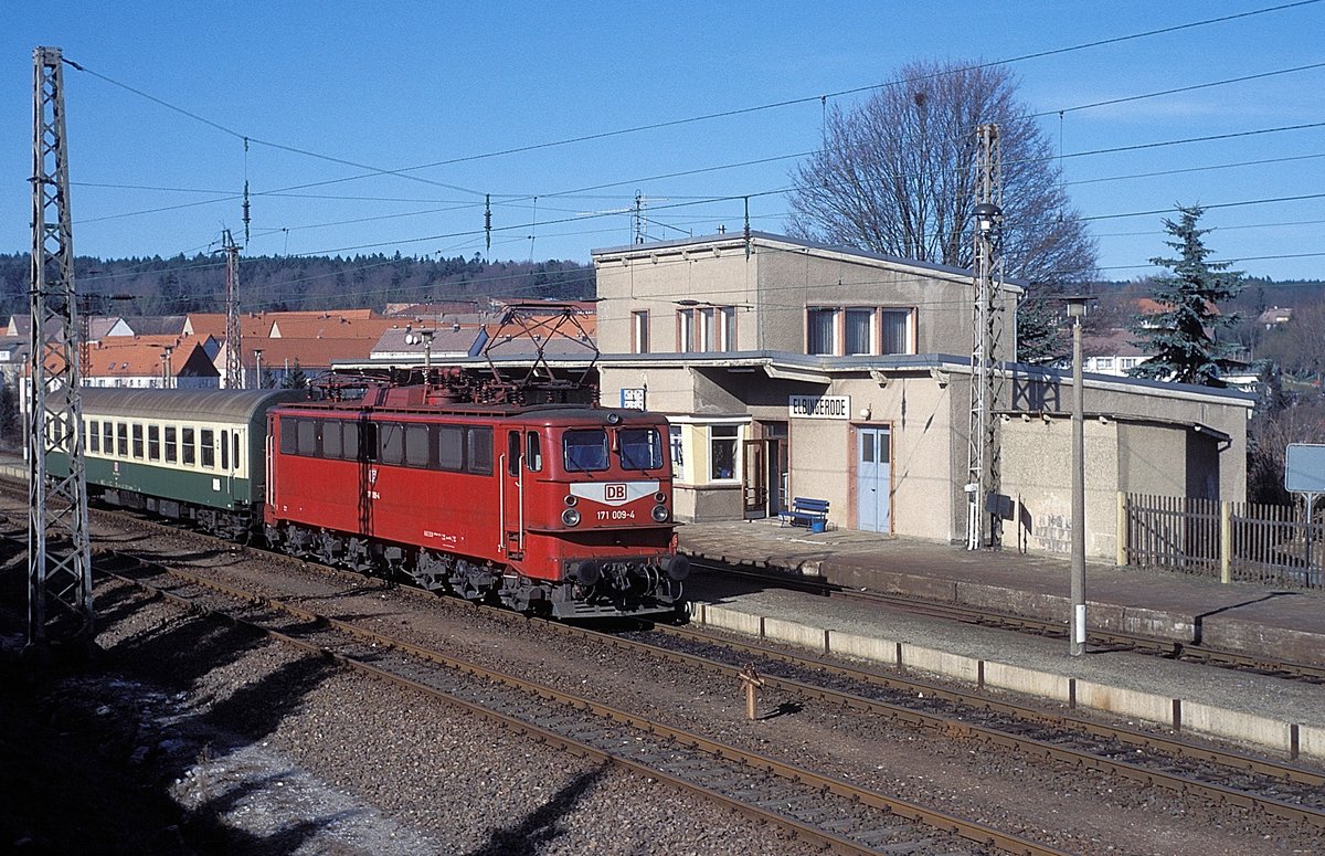 Bei der Ausfahrt aus dem HBF Leipzig am 26.4.1992 gelang dieses Foto am Bahnbetriebswerk Leipzig West mit der dort abgestellten 143229.