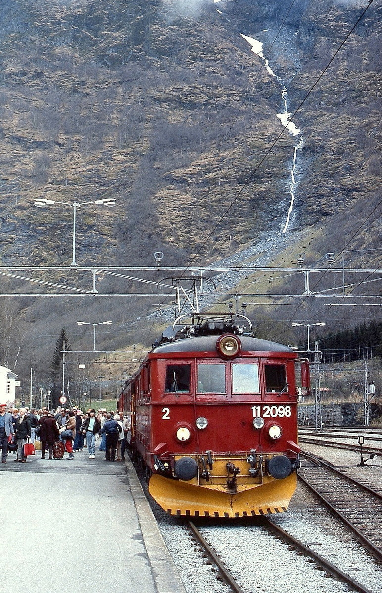 Anfang Mai 1988 steht El 11.2098 der NSB abfahrbereit nach Flam im Bahnhof Myrdal der Bergenbahn. Zwischen den beiden Bahnhöfen überwindet die Flambahn auf rund 20 km einen Höhenunterschied von 864 m bei einem maximalen Gefälle von 55 Promille, sie gehört damit zu den steilsten normalspurigen Adhäsionsbahnen der Welt. Die El 11.2098 wurde 1954 in Dienst gestellt und 1997 ausgemustert. Für den Einsatz auf der Flambahn erhielt sie zusammen mit zwei weiteren El 11 eine geänderte Getriebeübersetzung.