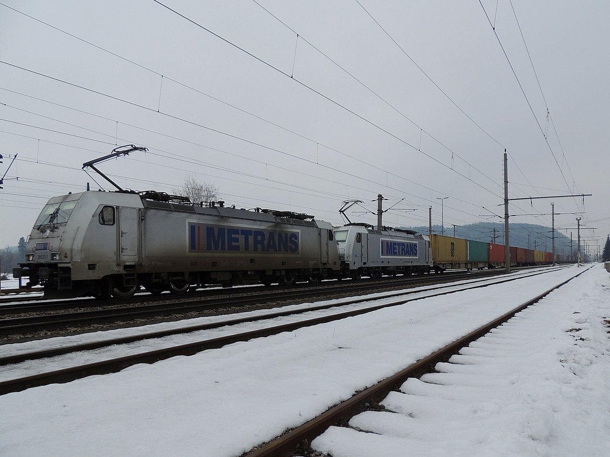386 011-1 METRANS, zieht, unterstützt von einer Schwesterlok, einen Containerzug bei Timelkam in Richtung Salzburg; 170209