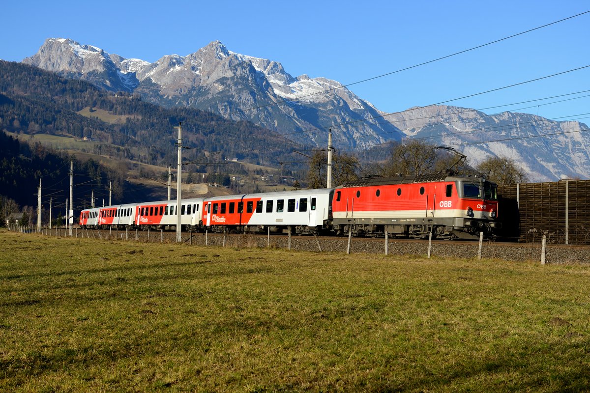 Auch 2015 gab es wieder den Wintervorspann im Ennstal. In den Wintermonaten kam es zwischen Bischofshofen und Selzthal planmäßig zu Vorspannleistungen bei den deutschen EC-Garnituren, um ein Liegenbleiben zu verhindern. Planmäßig war ein Triebfahrzeug der Baureihe 1144 dafür vorgesehen, oft konnte man aber auch eine 1142 vor diesen Zügen beobachten. Am 24. Dezember 2015 hatte ich mein Fotografen-Glück schon ausgeschöpft, der EC 217 hatte 1144.021 vorgespannt und konnte bei Eben im Pongau fotografiert werden. Nimmt man trotzdem mit, 1144er in EC Diensten und vor DB Wagenmaterial gibt es normalerweise ja auch nicht mehr...