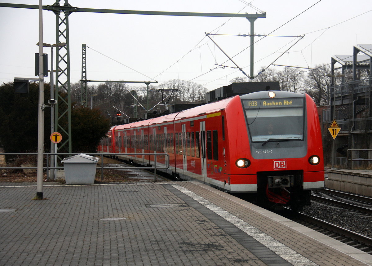 Die Rhein Niers Bahn (RB33) kommt aus Richtung Mönchengladbach-Hbf,Rheydt-Hbf,Wickrath,Beckrath,Herrath,Erkelenz,Baal,Hückelhoven-Baal,Brachelen,Lindern,Süggerrath,Geilenkirchen,Frelenberg,Zweibrüggen,Übach-Palenberg aus Duisburg-Hbf-Heinsberg-Rheinland)Aachen-Hbf und hält in Herzogenrath und fährt in Richtung Kohlscheid,Richterich,Laurensberg,Aachen-West,Aachen-Schanz,Aachen-Hbf. Aufgenommen vom Bahnsteig 2 in Herzogenrath. Bei Wolken am Kalten Nachmittag vom 4.2.2017.