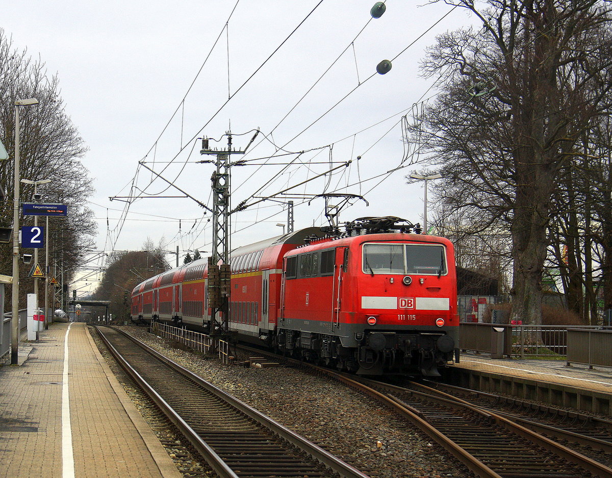Ein Nachschuss von der 111 115 DB schiebt den RE4 aus Aachen-Hbf nach Dortmund-Hbf und kommt aus Richtung Aachen-West,Laurensberg,Richterich, und fährt durch Kohlscheid in Richtung Herzogenrath,Mönchengladbach,Neuss. Aufgenommen vom Bahnsteig 2 in Kohlscheid. Bei Wolken am Kalten Nachmittag vom 5.2.2017.