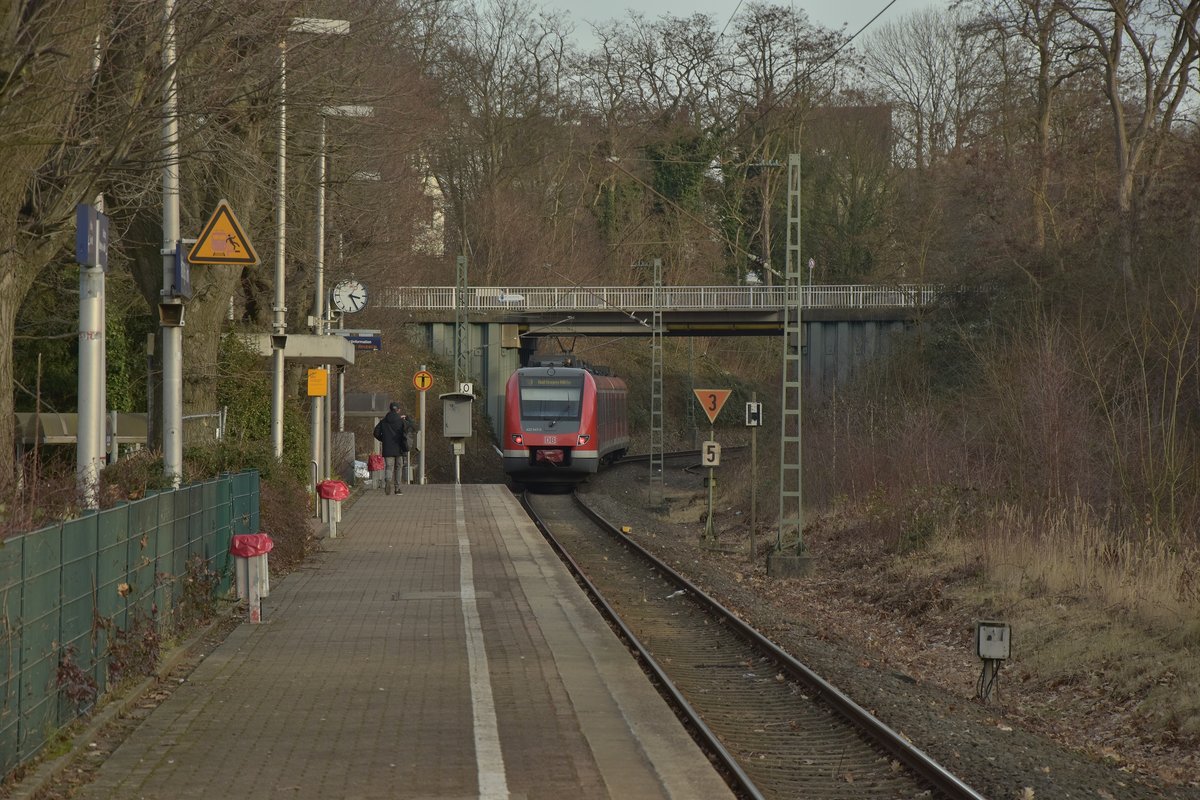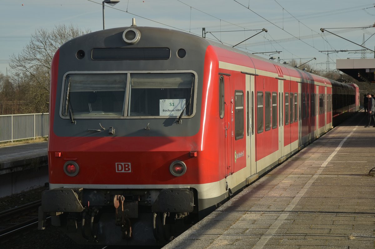 Eine S3 nach Hattingen Mitte verlässt Hattingen Ruhr, es vergehen nur wenige Minuten bis der Zug wieder hier einfährt, nur dann nach Oberhausen. Dann wird er einsame Fotograf in Hintergrund den Zug mit Spitzenlicht erwischen. (Dennis Fiedler von hinten )28.1.2017