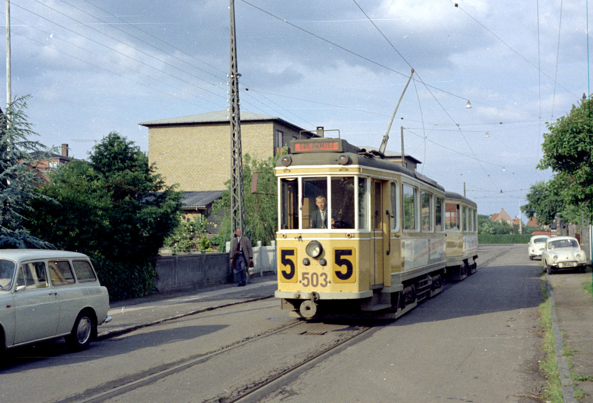 København / Kopenhagen Københavns Sporveje SL 5 (Tw 503 + Bw 15xx) København S, Sundbyøster, Kretavej (Betriebsstrecke zwischen der Backersvej und dem Straßenbahnbetriebsbahnhof Sundby) im Juni 1968. - Scan von einem Farbnegativ. Film: Kodacolor X.
