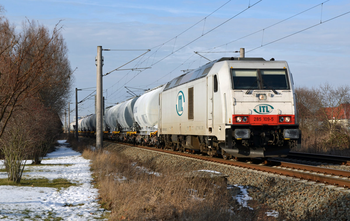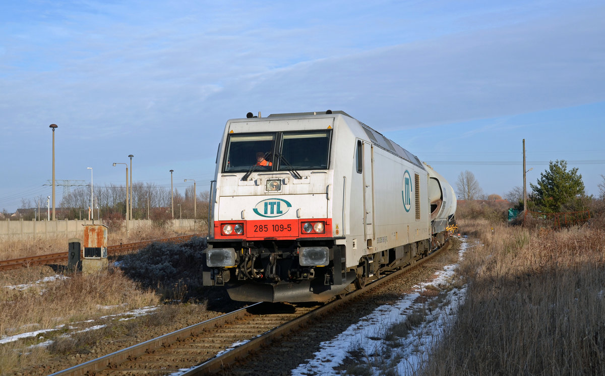 Mit dem Sodazug aus Stassfurt erreicht 285 109 am 29.01.17 in Kürze sein Ziel Bitterfeld, hier rollt der Zug durch Greppin.
