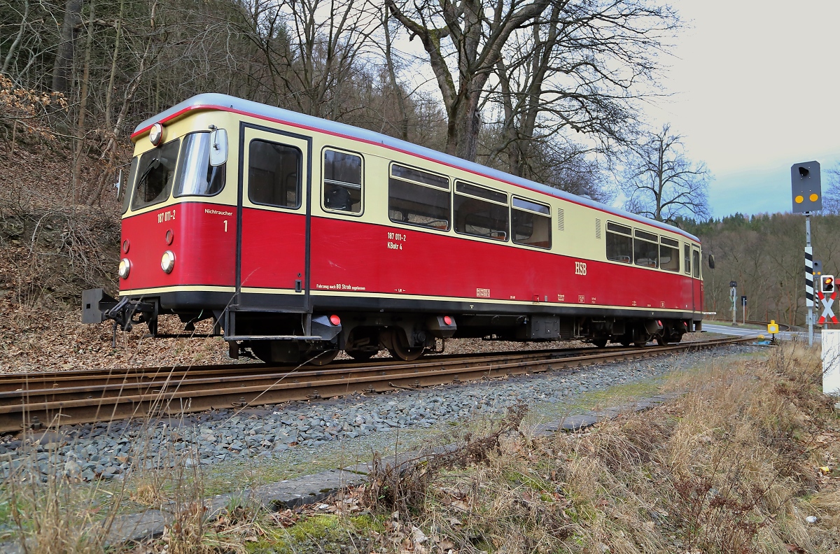 Triebwagen 187 011 als P8955 (Gernrode-Alexisbad) am 07.02.2016 bei der Einfahrt in den Haltepunkt Mägdesprung. (Bild 1)