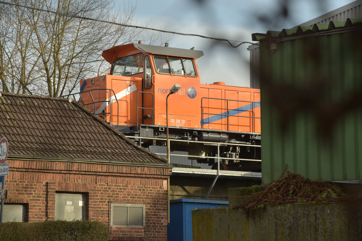 Über den Dächern von Nizza war ein beliebter Film aus den fünfziger Jahren, das hier ist über den Dächern von Hattingen, bei Reuschling im Werk als Detailansicht. Dort steht die als Köf 322 220 131 gekennzeichnete Lok auf dem Ausziehgleis an der Werkshalle in Hattingen. 28.1.2017
