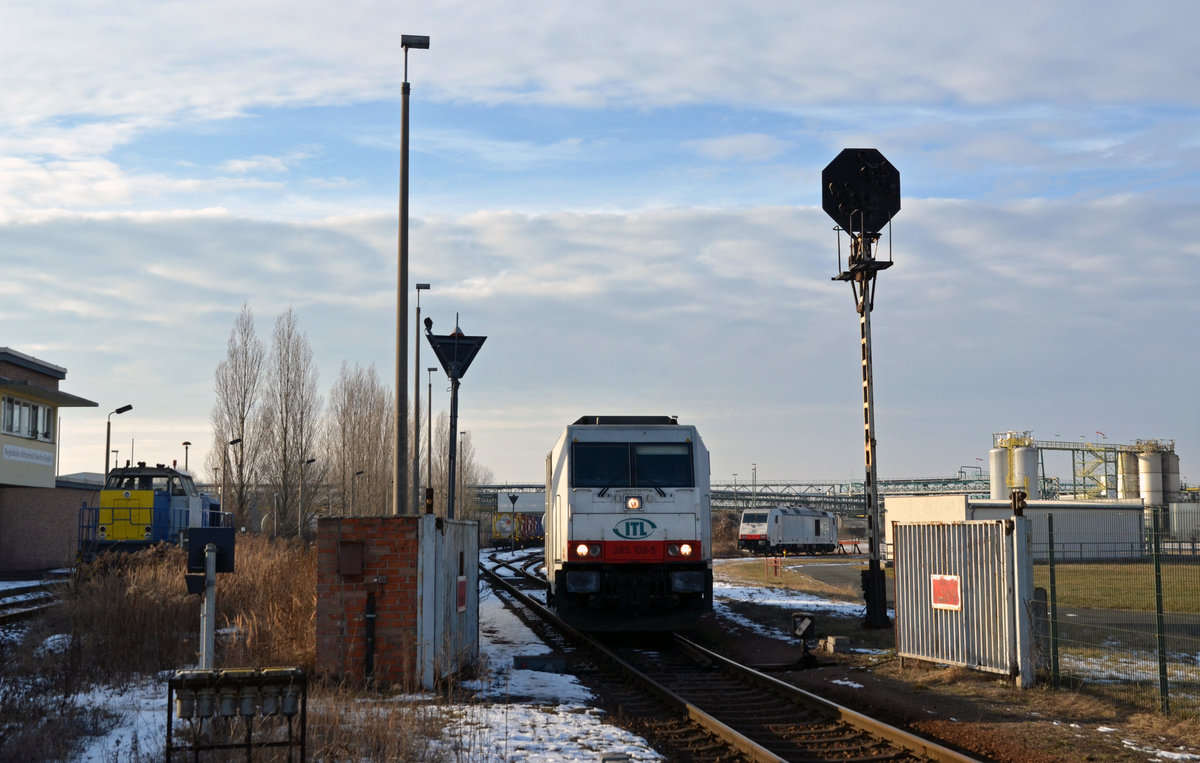 Nachdem 285 109 in Bitterfeld ihren Zug umfahren hatte zog sie ihn am 29.01.17 vom bahnhof Bitterfeld in den Chemiepark Bitterfeld.