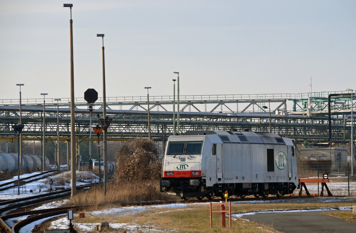Während im Hintergrund 285 109 bereits von ihrem Zug abgesetzt hat steht im Vordergrund 285 108 im Standort der Regiobahn Bitterfeld abgestellt. Fotografiert am 29.01.17 vom geöffneten BÜ Parsevalstraße.